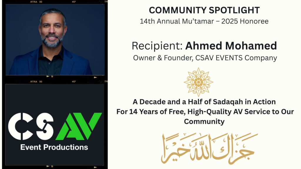 A special moment during the Mu’tamar was the recognition of Ahmed Mohamed, founder of CSAV Events in Newton, who received the Community Spotlight Award for providing exceptional audiovisual services to the Mu’tamar for all 14 years. Reflecting on the honor, Ahmed said he remembers when the Mu’tamar first began in 2009. He added, “My father always reminded me to serve the community in any form or shape. This work is part of his legacy, and I’m proud to continue it.” His dedication and consistency were applauded by attendees.